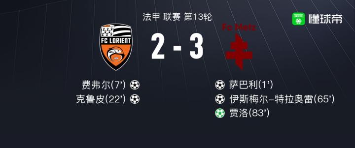 北京时间11月26日法甲 联赛 第13轮,洛里昂主场对阵梅斯。洛里昂费弗尔破门, 克鲁皮破门。梅斯萨巴利破门,伊斯梅尔-特拉奥雷破门,贾洛破门。最终比分2-3。