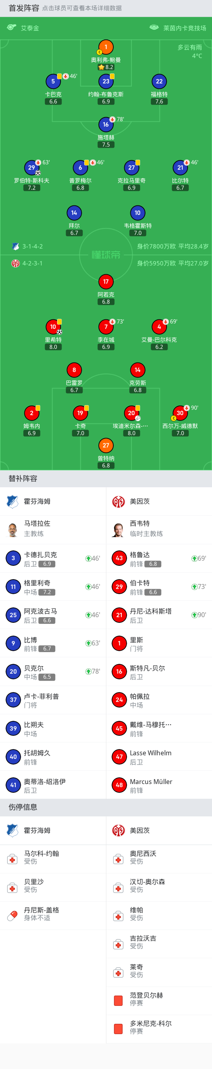 霍芬海姆首发:1-奥利弗-鲍曼, 22-福格特, 27-克拉马里奇, 23-约翰-布鲁克斯, 10-韦格霍斯特, 6-普罗梅尔, 29-罗伯特-斯科夫, 21-比尔特, 5-卡巴克, 16-施塔赫, 14-拜尔