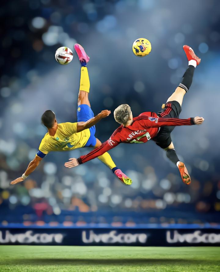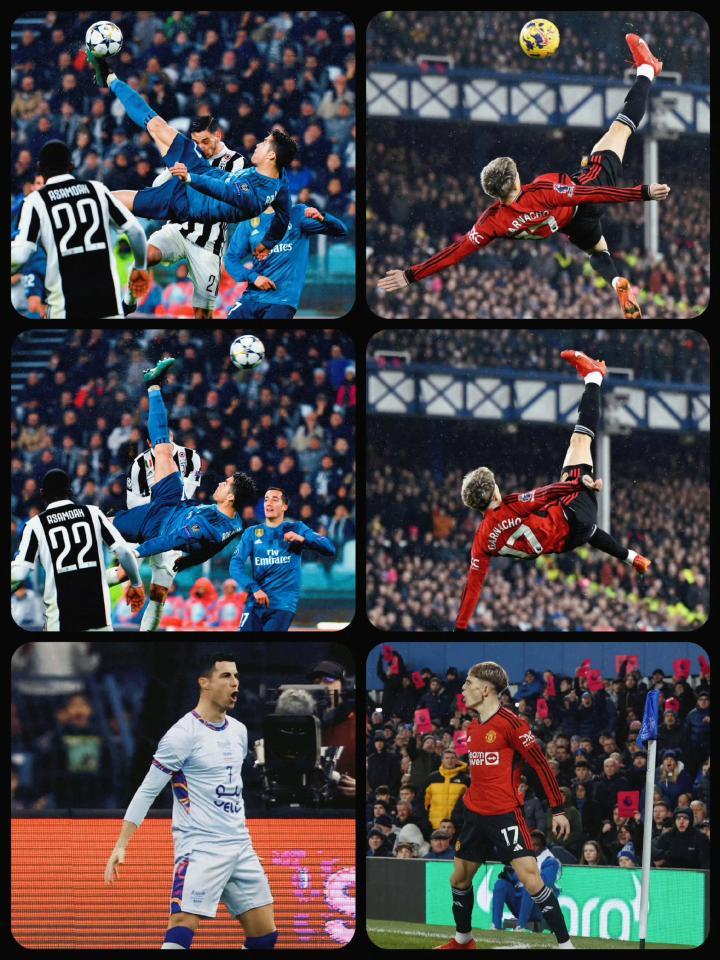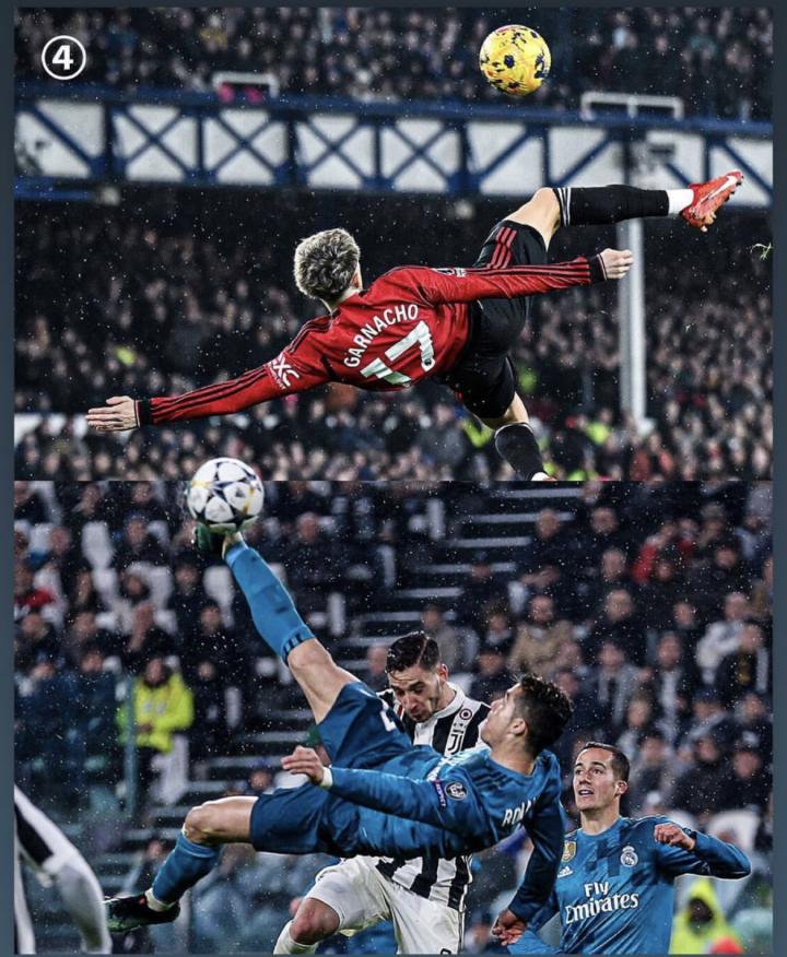 有趣的是,同样是在赛后,加纳乔更新自己的社交媒体,却是将自己的这个倒钩杰作与C罗当年效力皇马对战尤文时候的惊天倒钩进行了拼接。这也可以解释为什么他在破门庆祝时采用了模仿C罗“SIU”的动作。