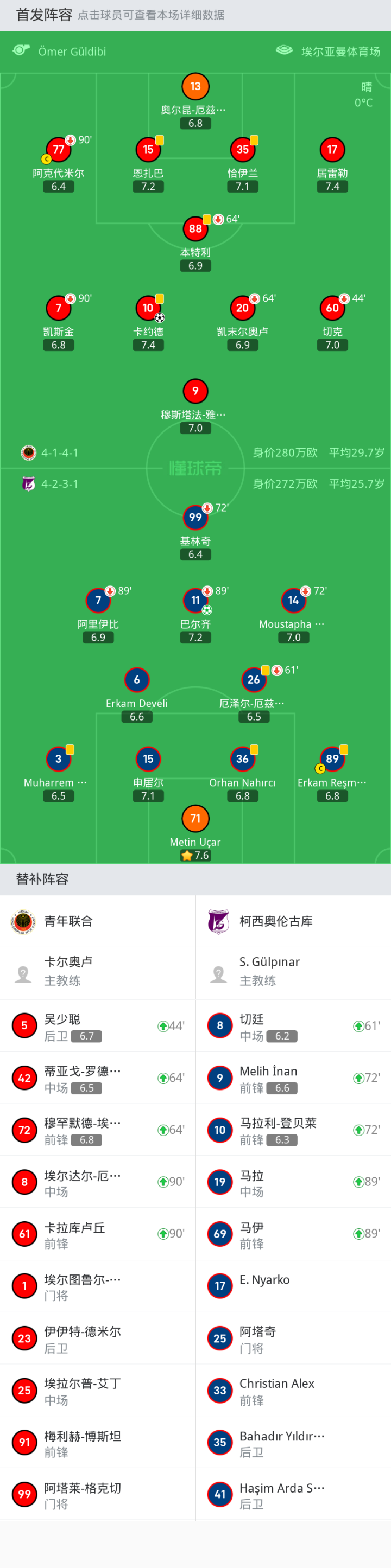 上场替补:90'+361-卡拉库卢丘, 64'42-蒂亚戈-罗德里格斯, 90'+38-埃尔达尔-厄兹蒂尔克, 64'72-穆罕默德-埃蒂尔克, 44'5-吴少聪