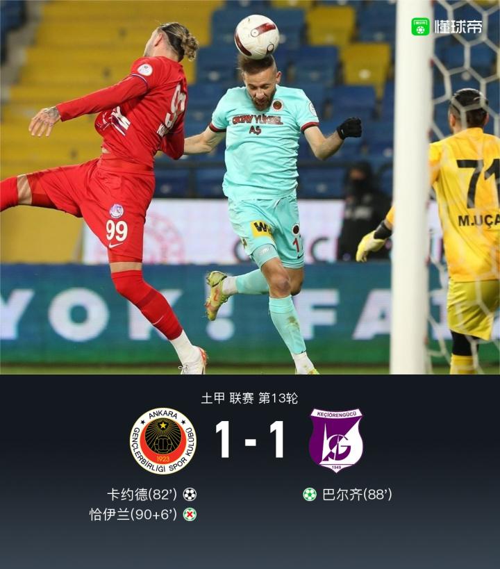 第88分钟,阿克代米尔送点,巴尔齐主罚命中,柯西奥伦古库1-1扳平比分