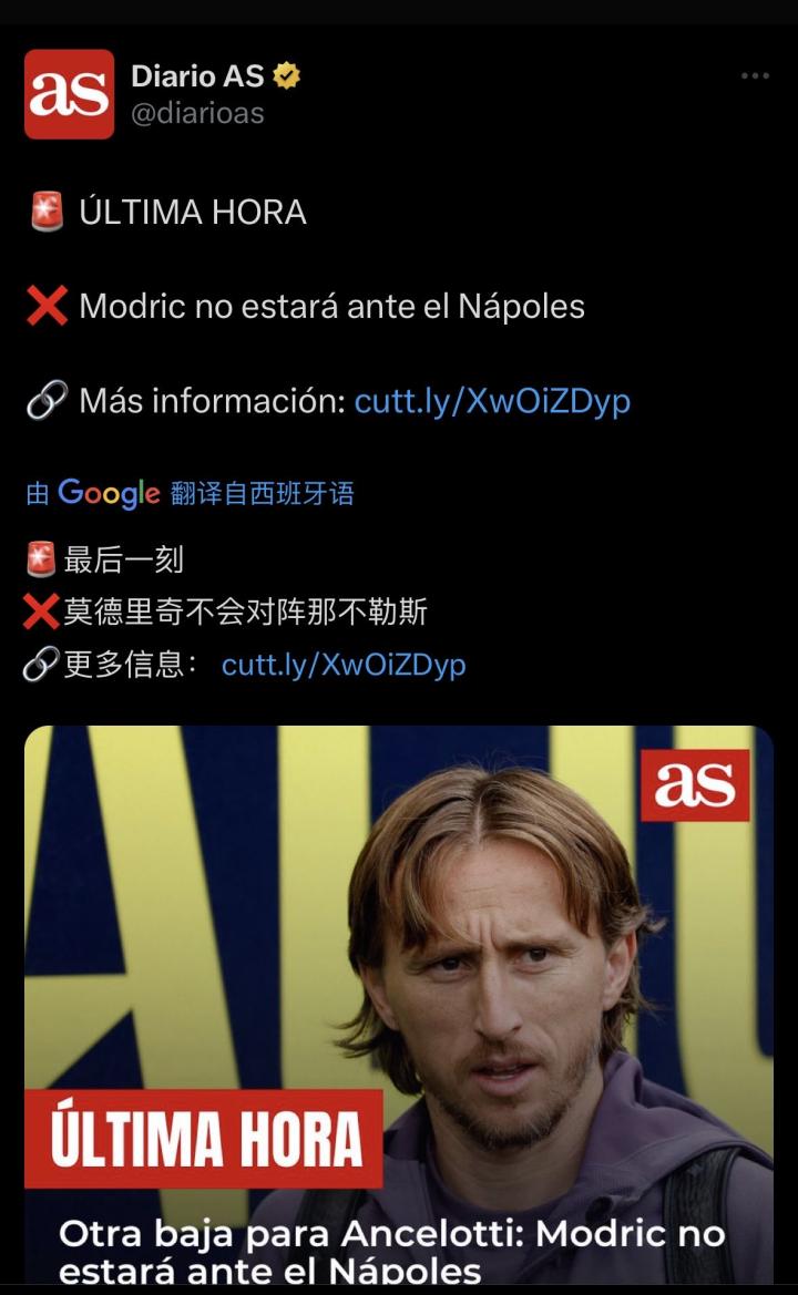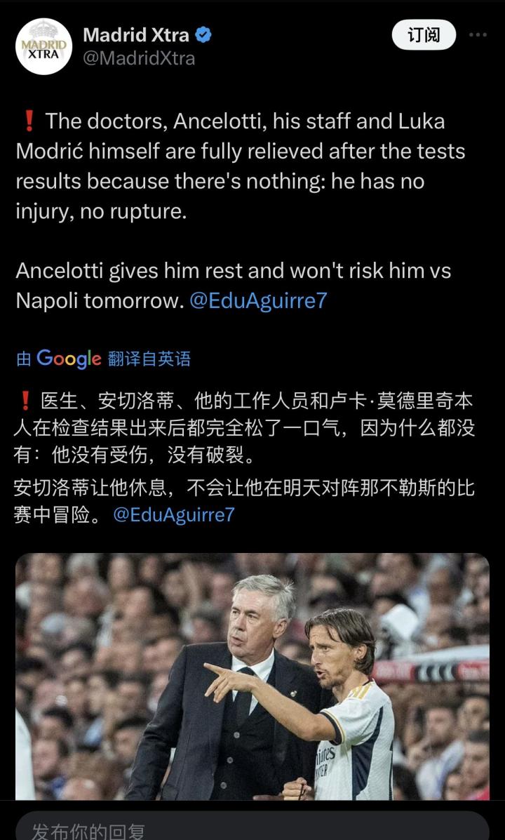 皇马中场莫德里奇没受伤,但是对那不勒斯会休息一场...马德里7号小俞2023-11-28 19:50皇马中场莫德里奇没受伤,但是对那不勒斯会休息一场 检查结果出来后,队医、安切洛蒂、他的工作人员和莫德里奇本人都松了口气,因为他没有受伤。 安切洛蒂让他休息,不会让他在明天对阵那不勒斯的比赛中冒险。 (消息源:Edu Aguirre)展开更多