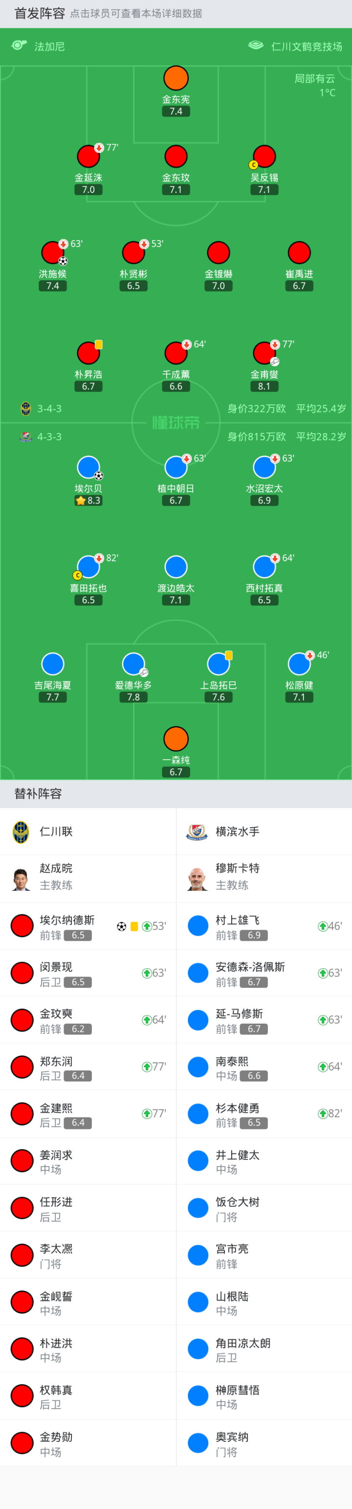 上场替补:77'14-郑东润, 53'10-埃尔纳德斯, 64'25-金玟奭, 63'28-闵景现, 77'44-金建熙