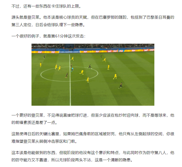 你终归无法指望登贝莱在防守中提供多么有效的帮助,所以巴黎圣日耳曼只能是7人防守,3人进攻,那么作为不是中锋,不是核心,处理球空间最大的第三人,登贝莱就必须打出高水平,从而抵消掉他作为右边前卫,本该在防守端提供的价值。