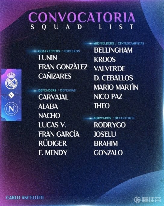 此前四战全胜的皇马此役获得了一些轮换的机会,在已经出线且几乎锁定小组第一的情况下,多达8人缺席的伤病满营的皇马可不希望再有人受伤了。此役齐祖的三儿子特奥-齐达内也进入了大名单,不知看在皇马功勋球员和教练的面子上,安帅能否给他一些上场时间?