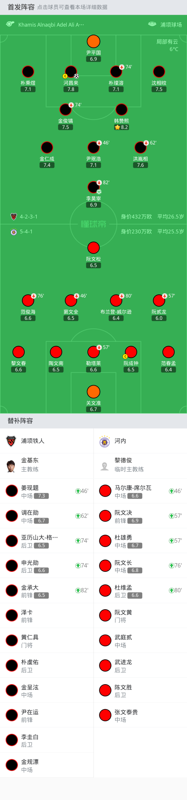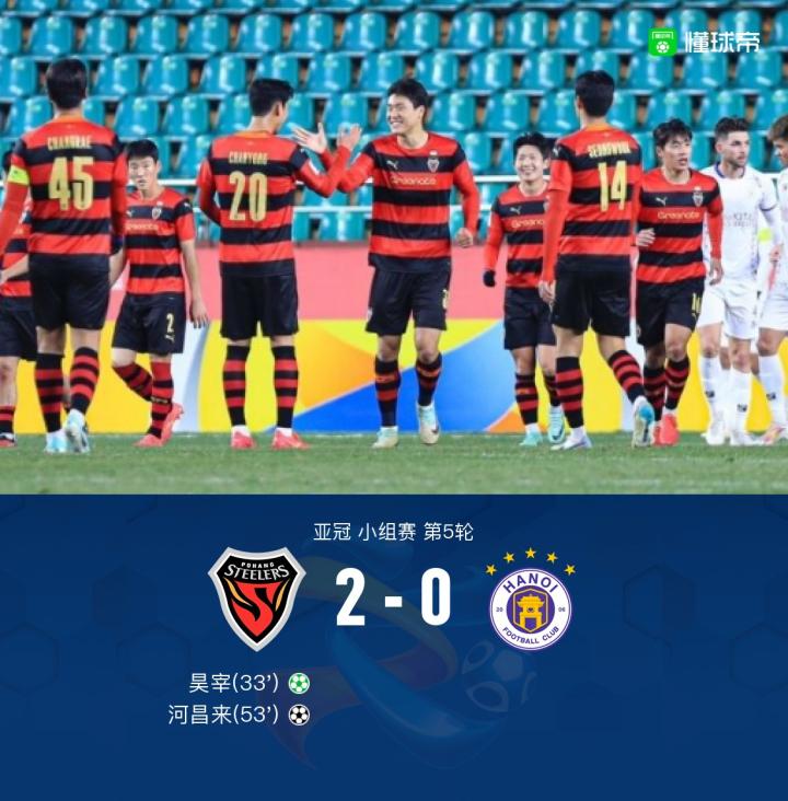 浦项铁人2-0河内迎小组赛五连胜,河昌来建功,李昊宰点射