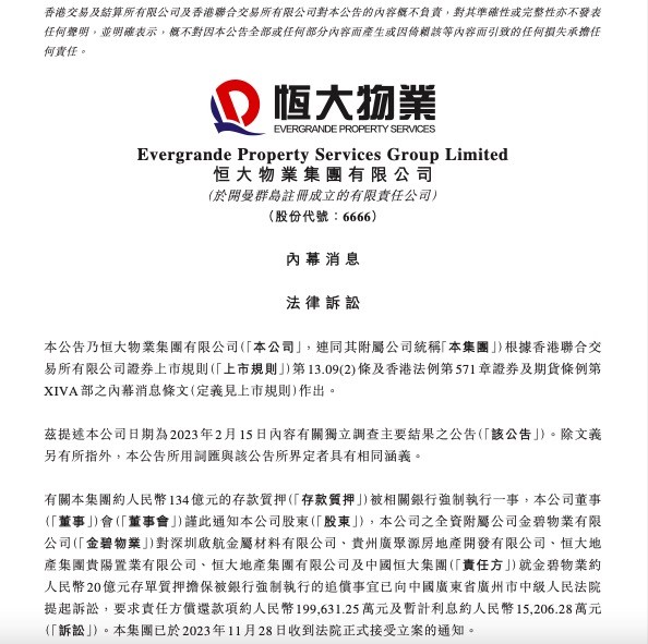【恒大物业状告恒大集团等多个责任方:要求偿还超20亿元款项】