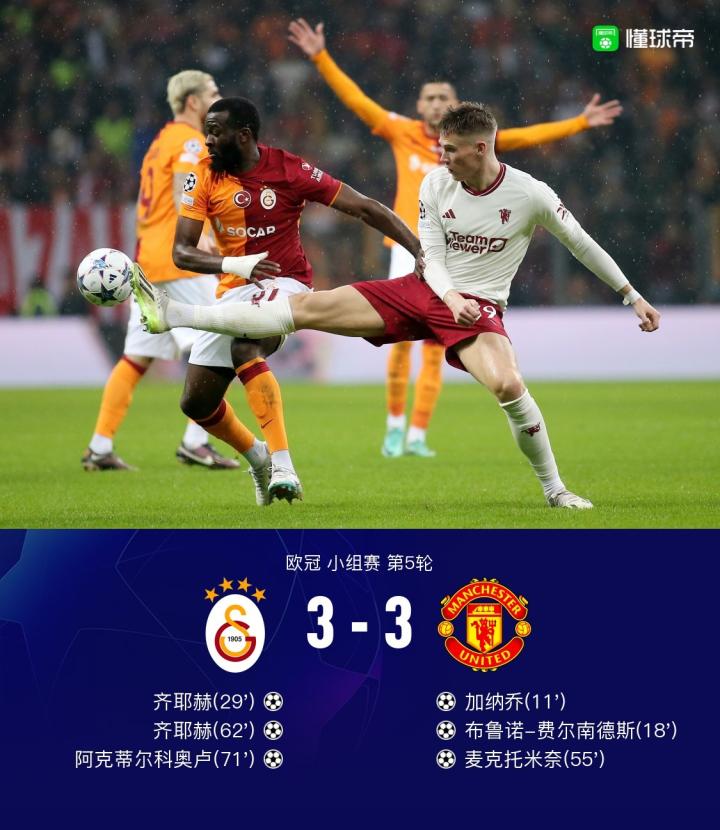【曼联3-3加拉塔萨雷仍垫底,B费传射加纳乔建功,齐耶赫造3球】