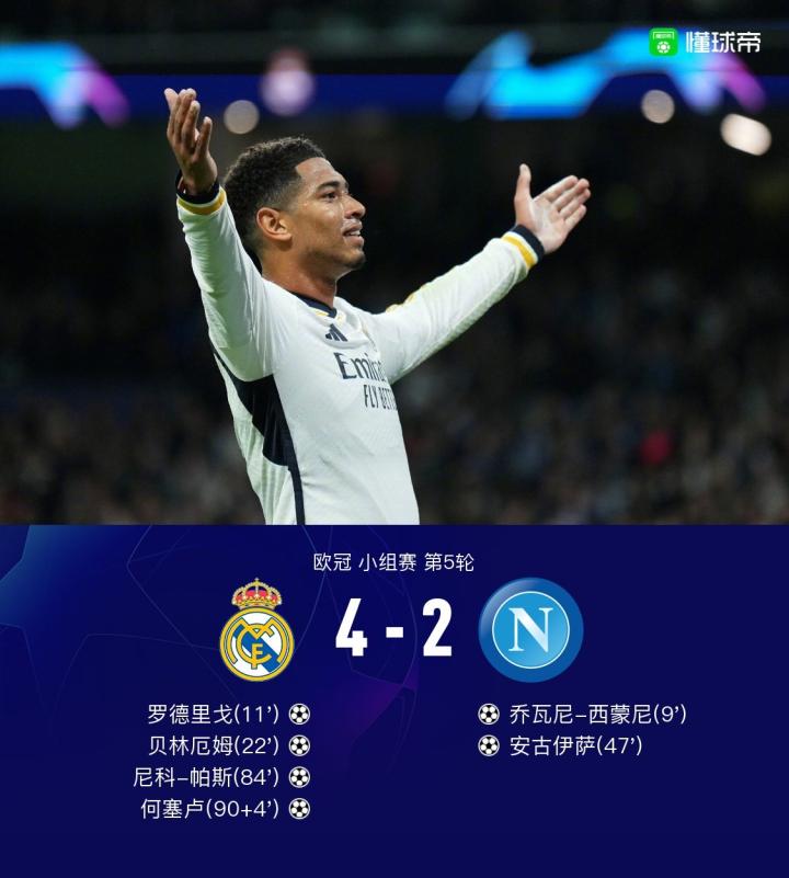【杰士邦 | 欧冠战报:皇马4-2那不勒斯锁头名,贝林厄姆传射】