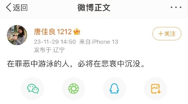 唐佳良发博写道:“在罪恶中游泳的人,必将在悲哀中沉没。”值得一提的是,唐佳良已经将社媒简介中的“杨鸣妻子”删掉,同时也删光了和杨鸣的合照。此外,唐佳良的关注列表中还出了多位“婚姻律师”,而社媒评论区也出现留言:“总会拨开云雾见光明。”