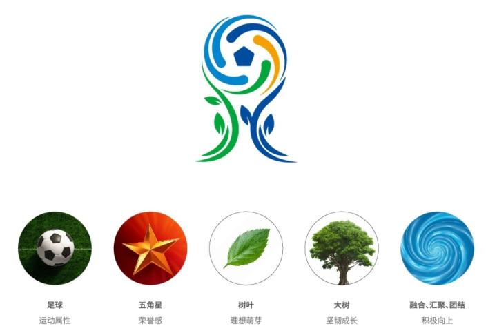 赛事标志灵感来源于枝繁叶茂扎根于土地的大树与足球元素相结合,大树代表中国青少年如树苗到大树般坚韧成长,在足球的陪伴下,闪耀光彩。4种不同颜色的线条环抱联结,象征着合作团结,代表4种不同年龄段的足球少年,围绕形成一个积极向上的足球形象。