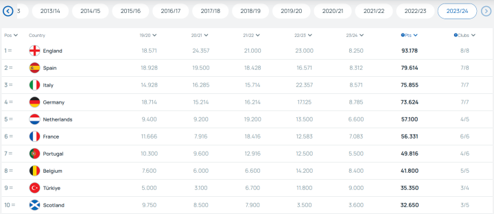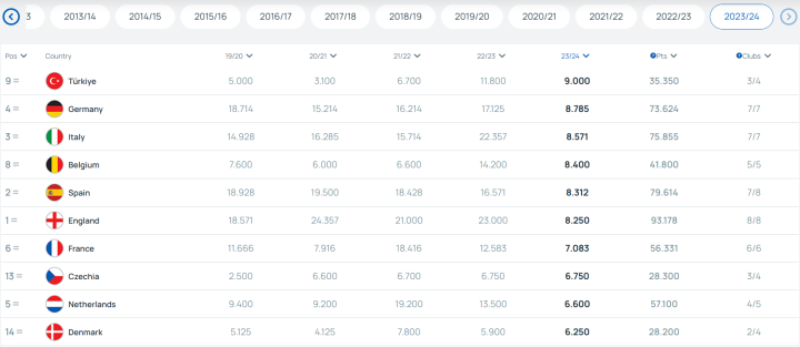 单赛季欧战积分土耳其和德国位列前二,意大利,比利时,西班牙和英格兰位居3-6。