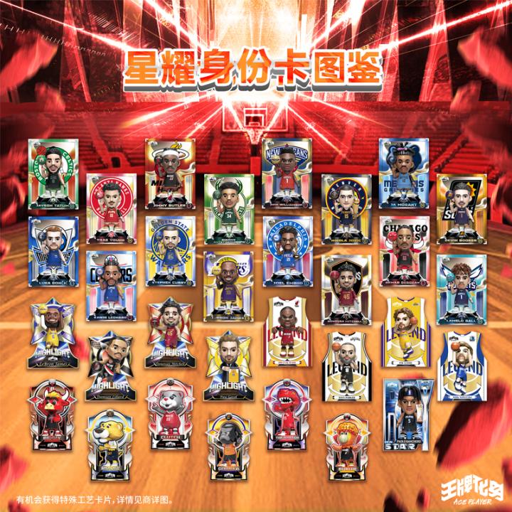 王牌化身NBA星耀系列产品对玩偶的身份卡本次也进行了升级,每款身份卡都有特殊工艺,随机跌落在盲盒内, 其中工艺包括 3D卡,光栅可变卡,光浮卡,光射卡,镭射卡。