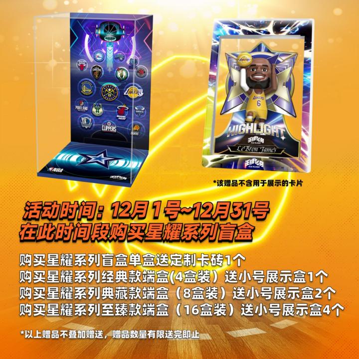 NBA星耀系列的包装规格共分三种,包括经典款(4 单盒装)、典藏款(8 单盒装)、至臻款(16 单盒装),不同的规格对应球迷不同的需求,也有不同的玩法,其中至臻款16 单盒装必出隐藏,想要收藏隐藏款系列的可以冲一冲了。