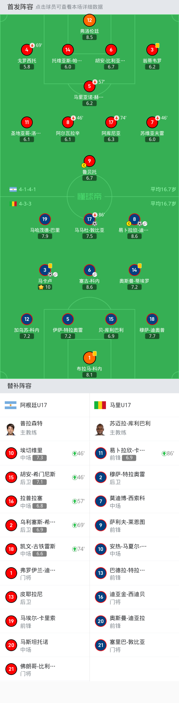 阿根廷U17首发:3-翁蒂韦罗, 5-马里亚诺-赫雷斯, 4-戈罗西托, 7-苏维亚夫雷, 9-鲁贝托, 17-阿库尼亚, 14-托维亚斯-帕拉西奥, 11-圣地亚哥-洛佩斯, 8-阿尔瓦拉辛, 6-胡安-比利亚尔瓦, 12-弗洛伦廷