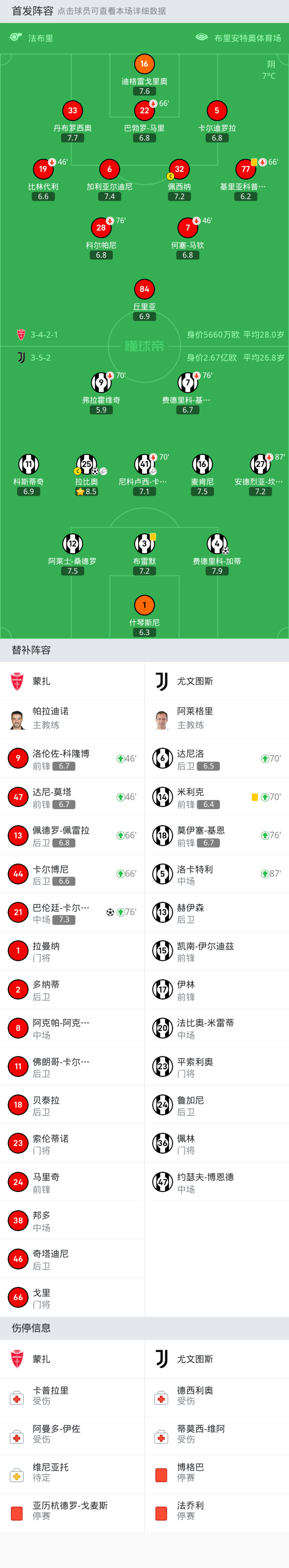 上场替补:70'6-达尼洛, 70'14-米利克, 87'5-洛卡特利, 76'18-莫伊塞-基恩