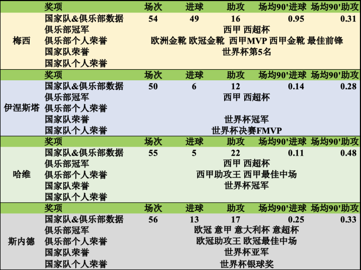 从集体荣誉看,梅西逊色,其他三位各有千秋。斯内德是俱乐部四冠王,还有世界杯亚军。哈维和伊涅斯塔俱乐部有西甲冠军和西超杯冠军,最重要的是获得了大力神杯。世界杯的分量每个人都知道,斯内德的冠军含金量是怎么也超越不了哈维和伊涅斯塔的。何况西甲在2010年是名副其实的世界第一联赛