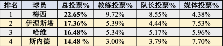 教练和队长投票梅西都是第一,媒体投票里梅西是在第四;斯内德则在媒体投票中排名第一,但伊涅斯塔和他的差距非常小。于是有人说,如果FIFA不和金球奖合并,就该斯内德获奖——这个是不够准确的。我们要注意几点: