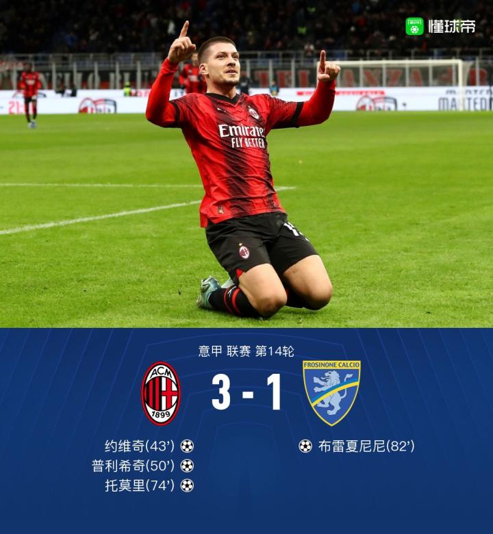 北京时间12月03日意甲 联赛 第14轮,AC米兰主场对阵弗罗西诺内。上半场,弗洛伦齐抽射打偏,约维奇打破僵局,库尼单刀推射被迈尼昂挡出。下半场,普利希奇扩大比分,约维奇助攻托莫里抢点破门,布雷夏尼尼任意球扳回一分,最终,米兰3-1弗罗西诺内。