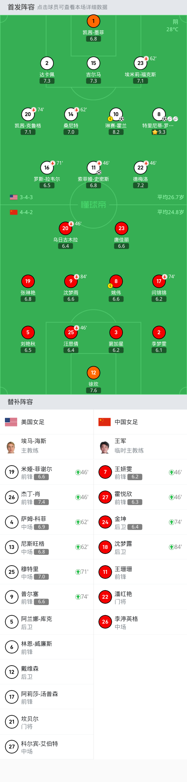 美国女足首发:10-琳赛-霍兰, 16-罗斯-拉韦尔, 14-桑尼特, 2-达卡佩, 11-索菲娅-史密斯, 1-凯茜-墨菲, 23-埃米莉-福克斯, 15-吉尔马, 22-德梅洛, 8-特里尼蒂-罗德曼, 20-凯茜-克鲁格