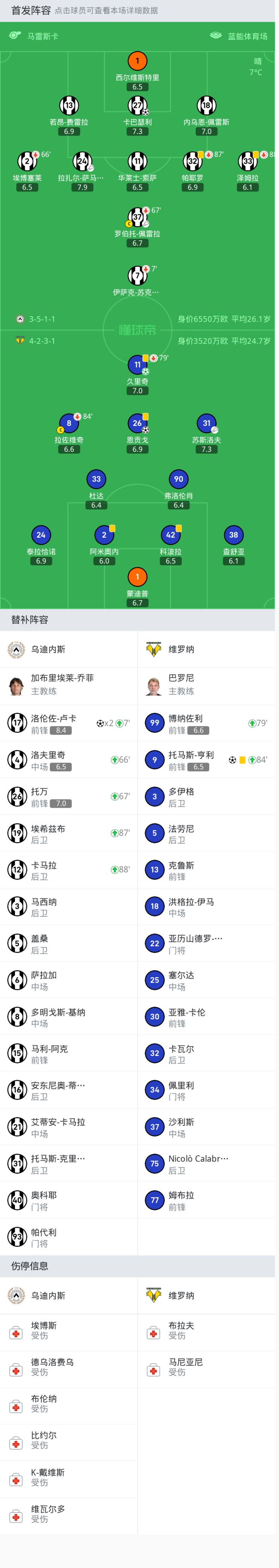 乌迪内斯首发:27-卡巴瑟利, 37-罗伯托-佩雷拉, 1-西尔维斯特里, 7-伊萨克-苏克塞斯, 11-华莱士-索萨, 18-内乌恩-佩雷斯, 32-帕耶罗, 13-若昂-费雷拉, 24-拉扎尔-萨马尔季奇, 33-泽姆拉, 2-埃博塞莱