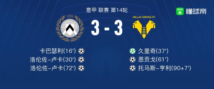 北京时间12月03日意甲 联赛 第14轮,乌迪内斯主场对阵维罗纳。乌迪内斯卡巴瑟利破门,洛伦佐-卢卡梅开二度。维罗纳久里奇破门,恩贡戈破门,托马斯-亨利破门。最终比分3-3。