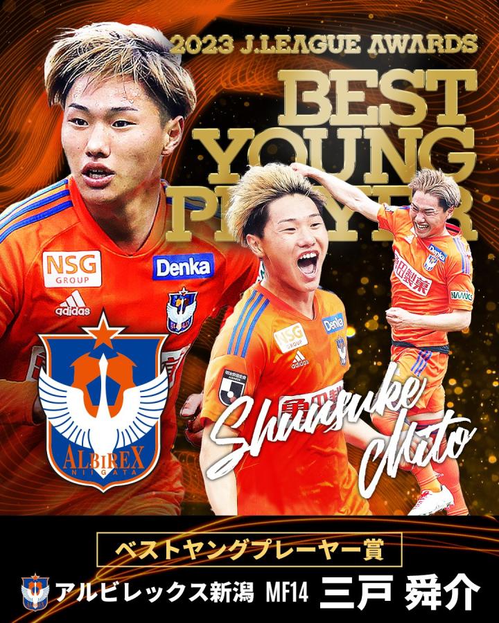 官方:新潟天鹅21岁中场三户舜介当选J12023赛季最佳年轻球员