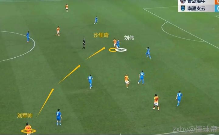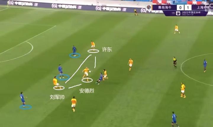 这就导致了,海牛三中卫身前的屏障不如上半程“厚实”,安德烈被迫要更多的前提,一方面压迫对手高中锋远离禁区,另一方面尽可能提前将球清理掉,减轻身后刘军帅与许东的防守压力(毕竟他们还要盯着边路补防)。