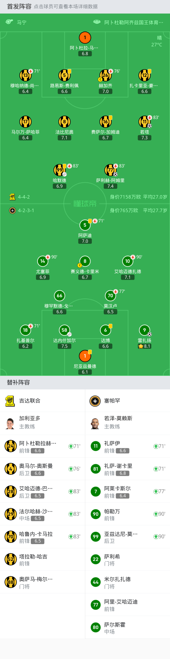 替换下场:76'26-赫加齐, 83'77-萨利赫-阿姆里, 83'99-哈默德, 83'11-若塔, 71'13-穆哈纳德-尚基提