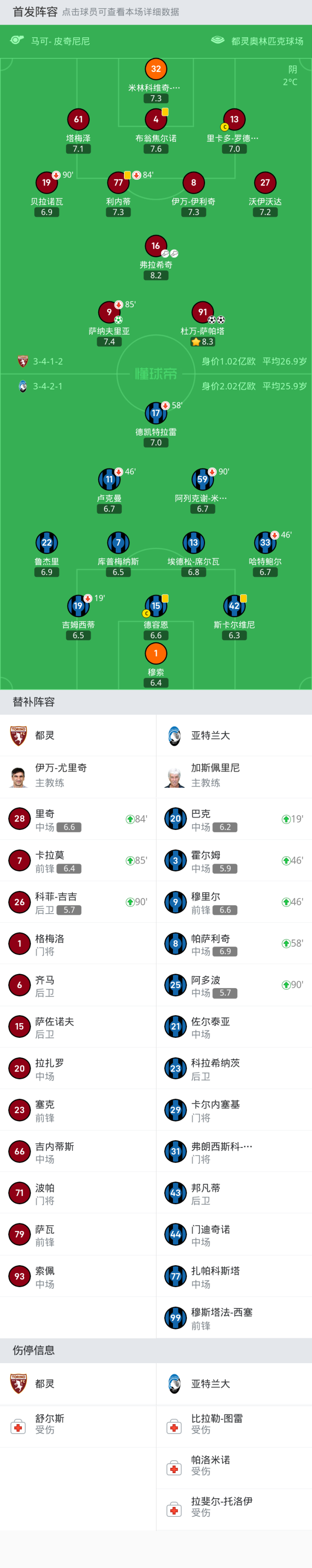 都灵首发:91-杜万-萨帕塔, 13-里卡多-罗德里格斯, 61-塔梅泽, 77-利内蒂, 9-萨纳夫里亚, 32-米林科维奇-萨维奇, 16-弗拉希奇, 27-沃伊沃达, 19-贝拉诺瓦, 4-布翁焦尔诺, 8-伊万-伊利奇