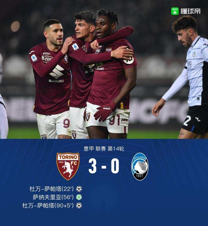 都灵3-0大胜亚特兰大,萨帕塔双响弑旧主,萨纳夫里亚点射