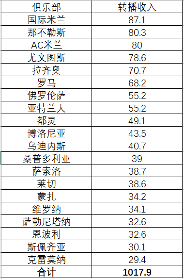 22-23赛季意甲各俱乐部联赛电视转播收入(百万欧元):