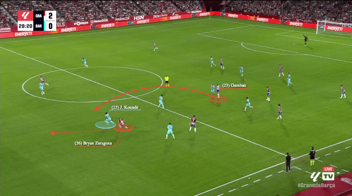1.贡巴乌从防守端接到球,发现队友的凌空跑动,并将球传到巴塞罗那的半场,让萨拉戈萨去追赶: