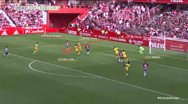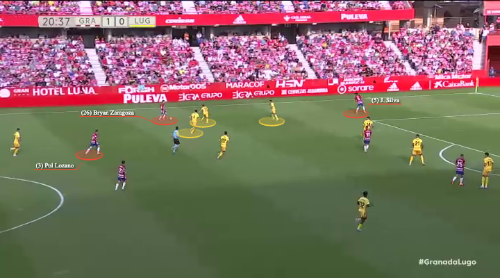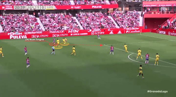 2.随着萨拉戈萨进一步进入这片巨大的空间,卢戈的一群球员开始向他靠近。此时他可以选择传球,霍纳坦·席尔瓦(Jonathan Silva)处于越位位置,所以最简单的选择就是把球传给波尔·洛萨诺(Pol Lozano)。然而,这位边锋决心继续突破,而卢戈的球员收拢(draw in tight)在他身边,准备破坏他继续带球: