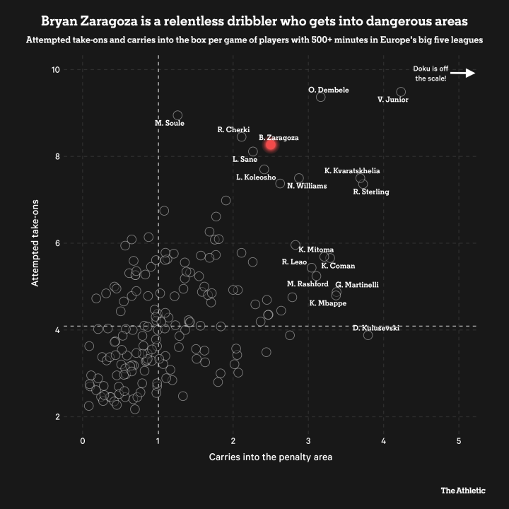 此图中的所有球员,都是五大联赛中,尝试带球过人和带球突入禁区时间长达500余分钟的球员,在平均每场比赛中这两项数据的体现。布里安·萨拉戈萨平均每场尝试过人8+次,带球突入禁区2.5次。