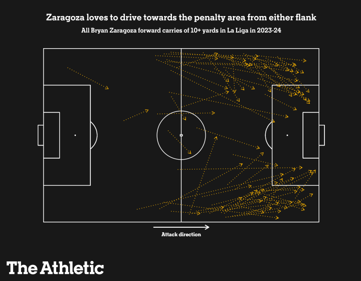 萨拉戈萨的生疏和不成熟,可谓是脱离足球学院环境之下的产物。但是这反而造就了他直接而自信的控球本领——本赛季,欧洲五大联赛只有5人的带球过人次数(Take-ons,指一名球员在带球的时候击败想要断球的防守球员)超过他,而他每场比赛2.5次带球进入对方禁区,凸显了他摆脱防守球员的能力。