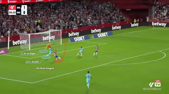4.萨拉戈萨准备射门,并让整个球场为他惊呼,包括昆代和门将特尔·施特根,他很快会射向球门上角:
