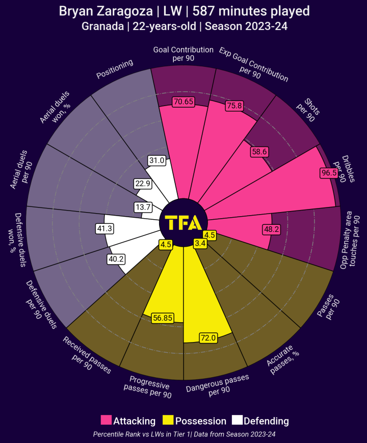 22岁的布里安·萨拉戈萨,在本赛季踢左边锋位置时长为587分钟。图示为TotalFootballAnalysis分析布里安·萨拉戈萨时所用到的的"风格饼图"。它根据五大联赛所有同位置球员的表现,综合对比后给出了排名。进攻方面用粉色表示,防守方面用白色表示,持球方面用黄色表示。在本文最后有各项指标的解释说明。