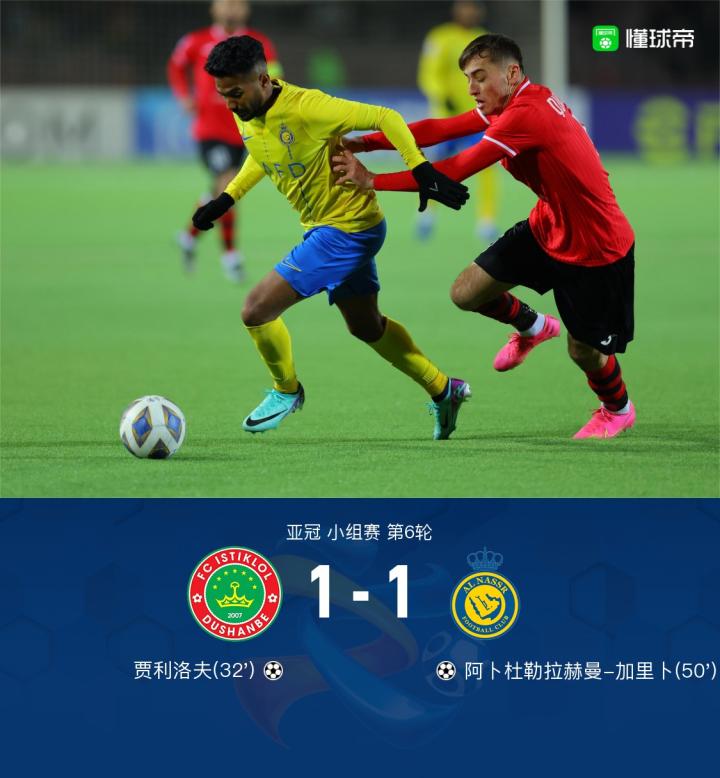 北京时间12月06日亚冠 小组赛 第6轮,杜尚别独立主场对阵利雅得胜利,C罗缺席本场比赛。上半场,加里卜回传失误,贾利洛夫贴地斩破门;下半场,加里卜连续两脚攻门将比分扳平。最终,利雅得胜利客场1-1战平杜尚别独立。