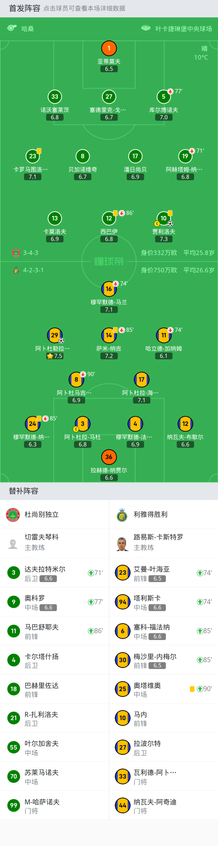 杜尚别独立首发:10-贾利洛夫, 19-阿赫塔姆-纳扎罗夫, 27-塞德里克-戈古阿, 8-贝加诺维奇, 33-诺沃塞莱茨, 12-西巴伊, 17-潘日尚贝, 1-亚蒂莫夫, 13-卡莫洛夫, 23-卡罗马图洛佐达, 5-库尔博诺夫