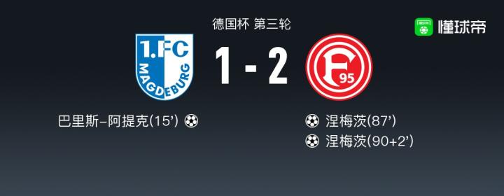 北京时间12月06日德国杯 第三轮,马格德堡主场对阵杜塞尔多夫。马格德堡巴里斯-阿提克破门。杜塞尔多夫涅梅茨梅开二度。最终比分1-2。
