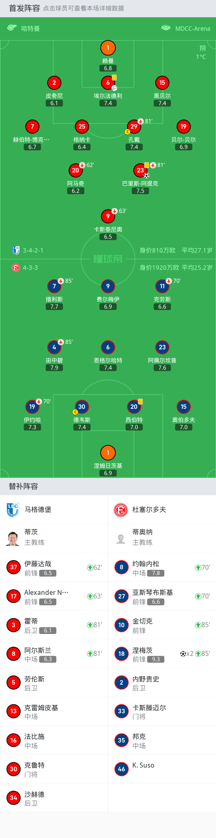 马格德堡首发:9-卡斯泰尼奥, 2-皮奇尼, 7-赫伯特-博克霍恩, 23-巴里斯-阿提克, 15-黑贝尔, 19-贝尔-贝尔, 1-赖曼, 29-孔戴, 25-格纳卡, 20-阿马奇, 6-埃尔法德利