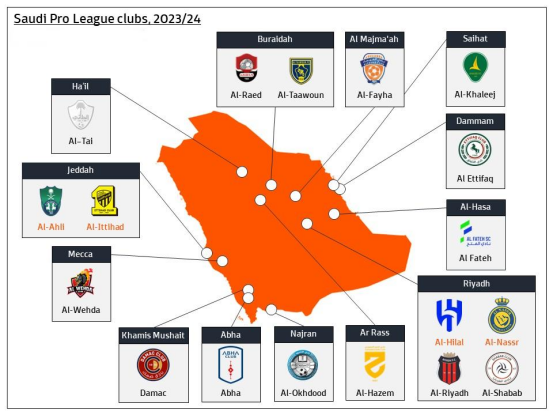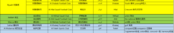 而如果你玩足球经理,不管是英文还是中文,估计也很难认清沙特球队哪只是哪只。所以我们今天就来聊一聊沙特顶级联赛球队的名字都有什么含义,他们的中文名字又是怎么来的。