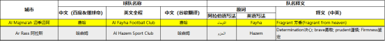 而在沙特阿拉伯职业足球联赛的18支球队中,有16支球队的名字结构都是"Al"加一个特定词汇,只有2支球队的名字与所在城市有关,所以国内主流翻译为了防止出现音译或意译上的重复与混乱,就对其中的12支球队都采用了城市+原有词汇意译的特殊翻译方式来翻译队名,他们分别是利雅得胜利(Al Nassr)、利雅得体育(Al-Riyadh)、利雅得青年(Al-Shabab)、利雅得新月(Al Hilal)、吉达联合(Al-Ittihad)、吉达国民(Al-Ahli)、麦加统一(Al-Wehda)、赛哈特海湾(Al-Khaleej)、哈萨征服(Al Fateh)、达曼协作(Al-Ettifaq)、布赖代合作(Al Taawoun)、布赖代先锋(Al Raed)。