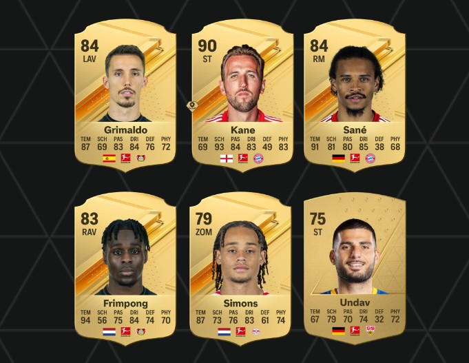 德甲官方公布了11月最佳球员候选,凯恩、萨内、哈维-西蒙斯、弗林蓬、昂达夫、格里马尔多六人在列。