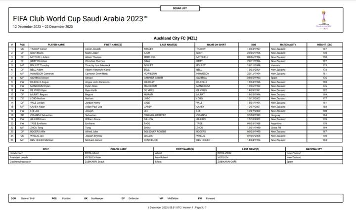 国际足联通过官方网站公布了新西兰奥克兰城队参加世俱杯的名单。中国球员周通在列。