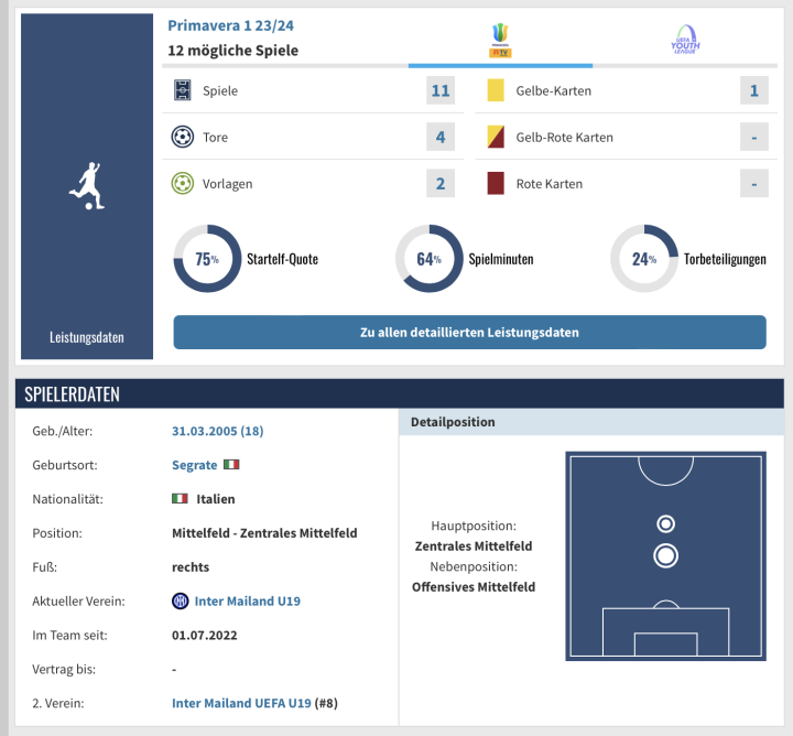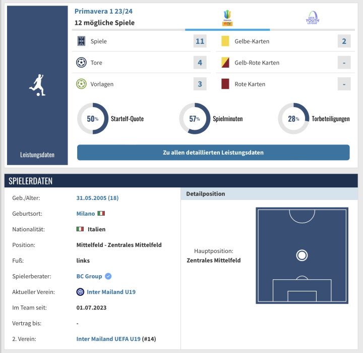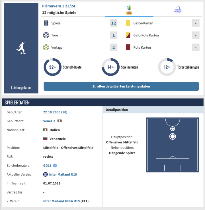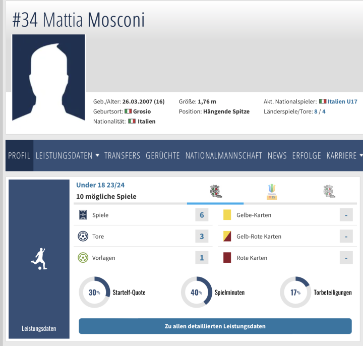 U18联赛简要介绍,莫斯科尼之前圈里发贴说他本赛季表现一般,其实不然,本赛季他代表国米是8场4球1助攻,代表意大利u17是5场比赛3球2助攻。他确实代表预备队只提过一场比赛替补上场没有什么两眼的发挥,主要原因是预备队锋线人满为患,还有去年重伤的祖贝雷克,国米青训还是比较论资排辈的。上赛季如果不是祖贝雷克重伤,小小埃斯也不会异军突起。所以现在对莫斯科尼评判还维持尚早,本赛季他的表现还是不错的,只是没有直接跳级到预备队而已。另外泽菲感觉齐沃并不喜欢他,也没给他太多机会,最近也没有他续约的消息,大概率下赛季是不会留队了。德皮埃里新赛季是5球3助攻,表现抢眼,他的技术非常出色,但是身体略单薄。
