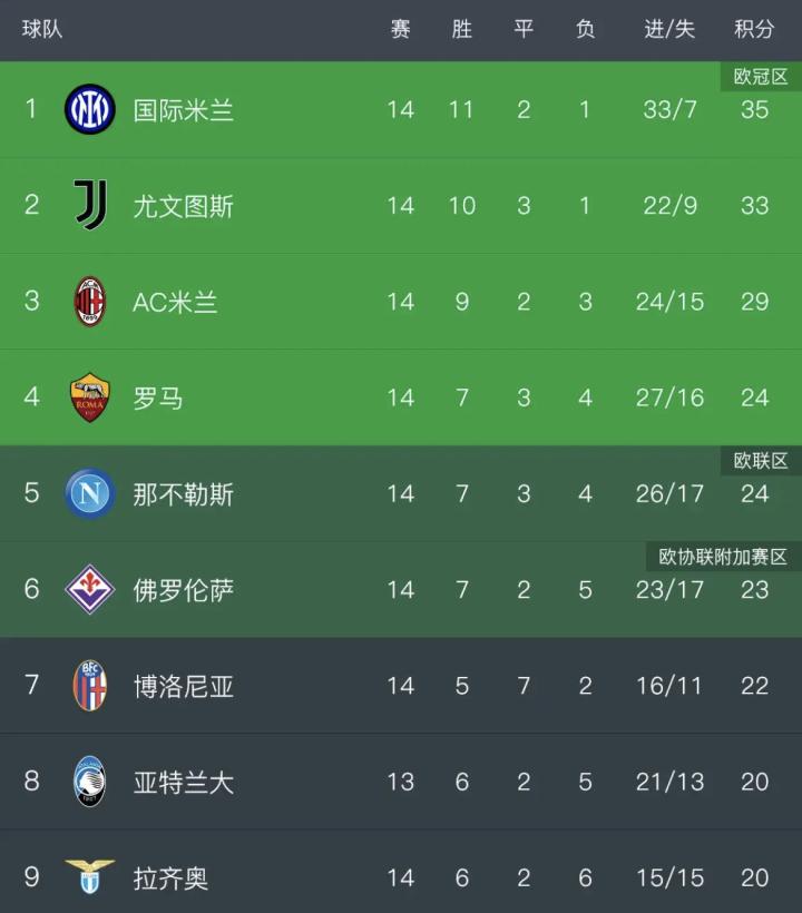 尤文图斯本赛季表现抢眼,14轮比赛后以10胜3平1负的战绩积33分排在积分榜第二位,只落后领头羊国际米兰2分。