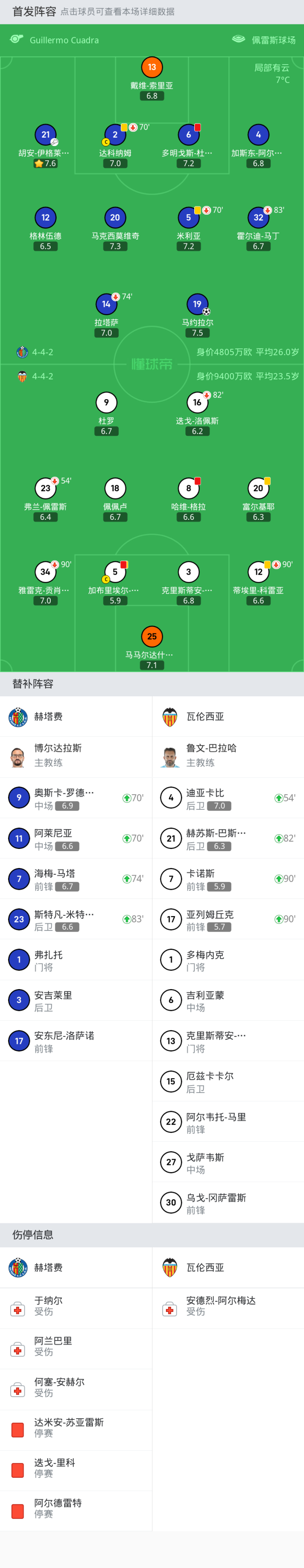 瓦伦西亚首发:5-加布里埃尔-保利斯塔, 20-富尔基耶, 18-佩佩卢, 9-杜罗, 12-蒂埃里-科雷亚, 25-马马尔达什维利, 23-弗兰-佩雷斯, 16-迭戈-洛佩斯, 3-克里斯蒂安-莫斯克拉, 34-雅雷克-贡肖罗夫斯基, 8-哈维-格拉