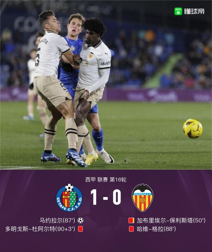 10人赫塔费1-0战胜9人瓦伦西亚,马约拉尔绝杀,全场3张红牌